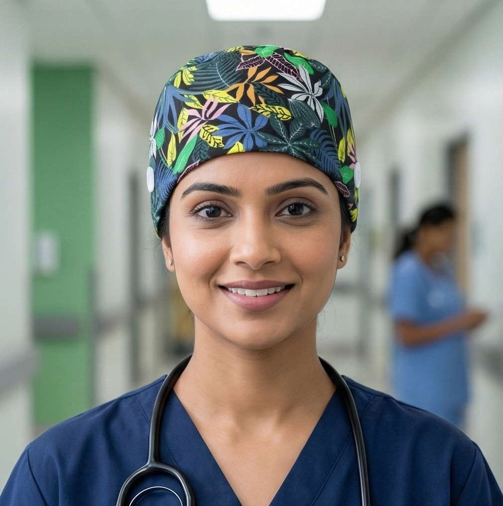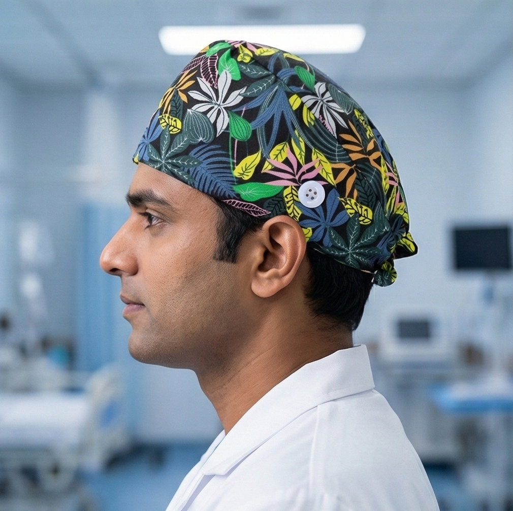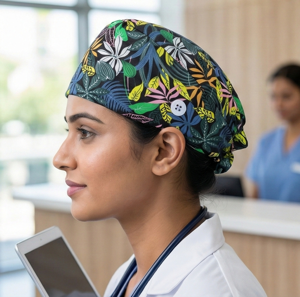 Make a sophisticated statement with our stunning Dark Tropical scrub cap! Featuring exotic tropical flowers and lush leaves on a dramatic dark background, this cap combines island vibes with modern elegance. Perfect for professionals who want tropical flair with a bold, contemporary twist.